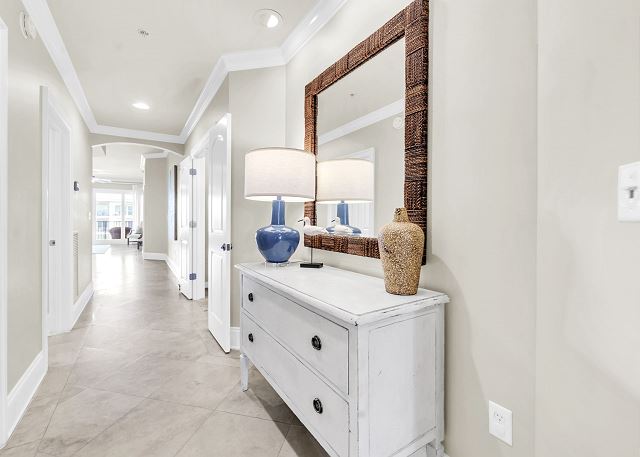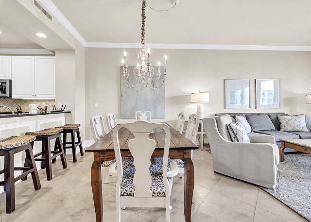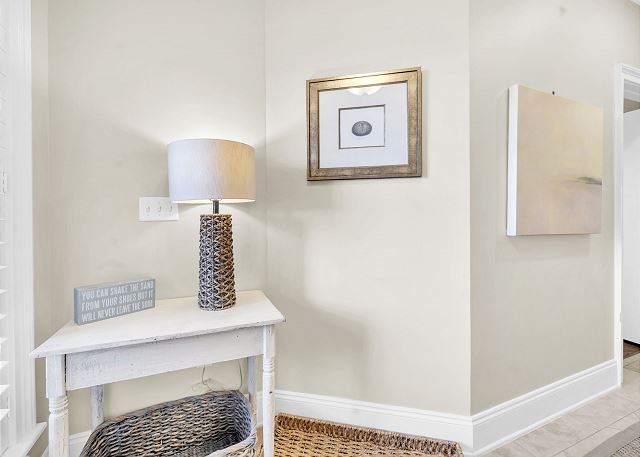 Beautiful condo with up-to-date, good quality furnishings. The pictures are accurate, and we loved that the blue chairs were gliders. The kitchen was well stocked with dishes and kitchen utensils. There are a few games and books stored under the television. The pack'n play was there as promised and the rooms are nice-sized. The pool was clean and very pretty. The walk to the beach was easy and the stairway down was very sturdy and well-maintained. We were lucky and the water was peaceful and calm all week. Renting a large umbrella and chairs was really worth it with two little ones. The fourth floor was a good choice as we never heard pool noise, and actually never heard our next door neighbors either.