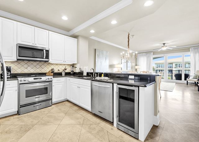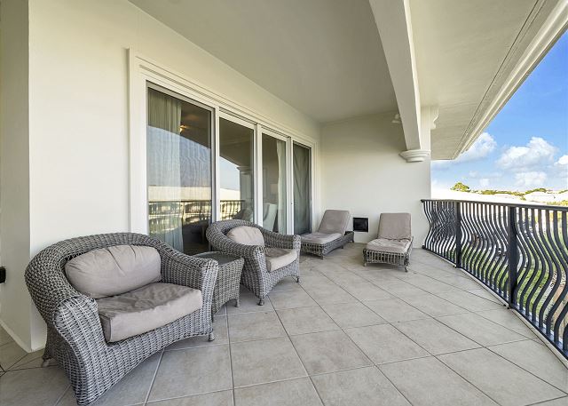 The fully equipped, gourmet kitchen has granite countertops with marble back splashes, and KitchenAid appliances. The dining room seats six with room for three more at the bar. The balcony has lounge chairs to enjoy the amazing view.